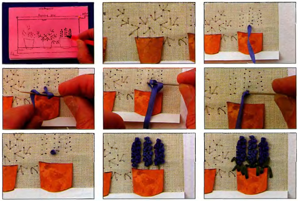 19. Вышейте герань ленточками шириной 4 мм цвета семги и абрикоса. Обратитесь к описаниям на с. 22 для дельфиниумов. Вышейте петли длиной 44 мм, а нитками в тон в два сложения закрепите каждую петлю французским узелком в один оборот. Вышейте стебли зелеными нитками, листья - прямыми стежками ленты цвета мха, шириной 7 мм. Некоторые листья должны располагаться поверх горшка.